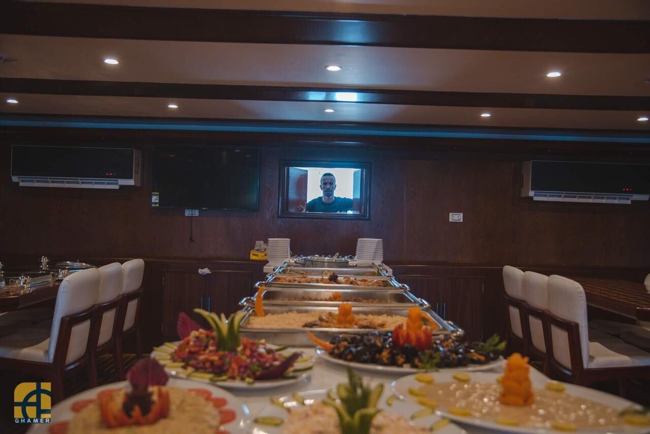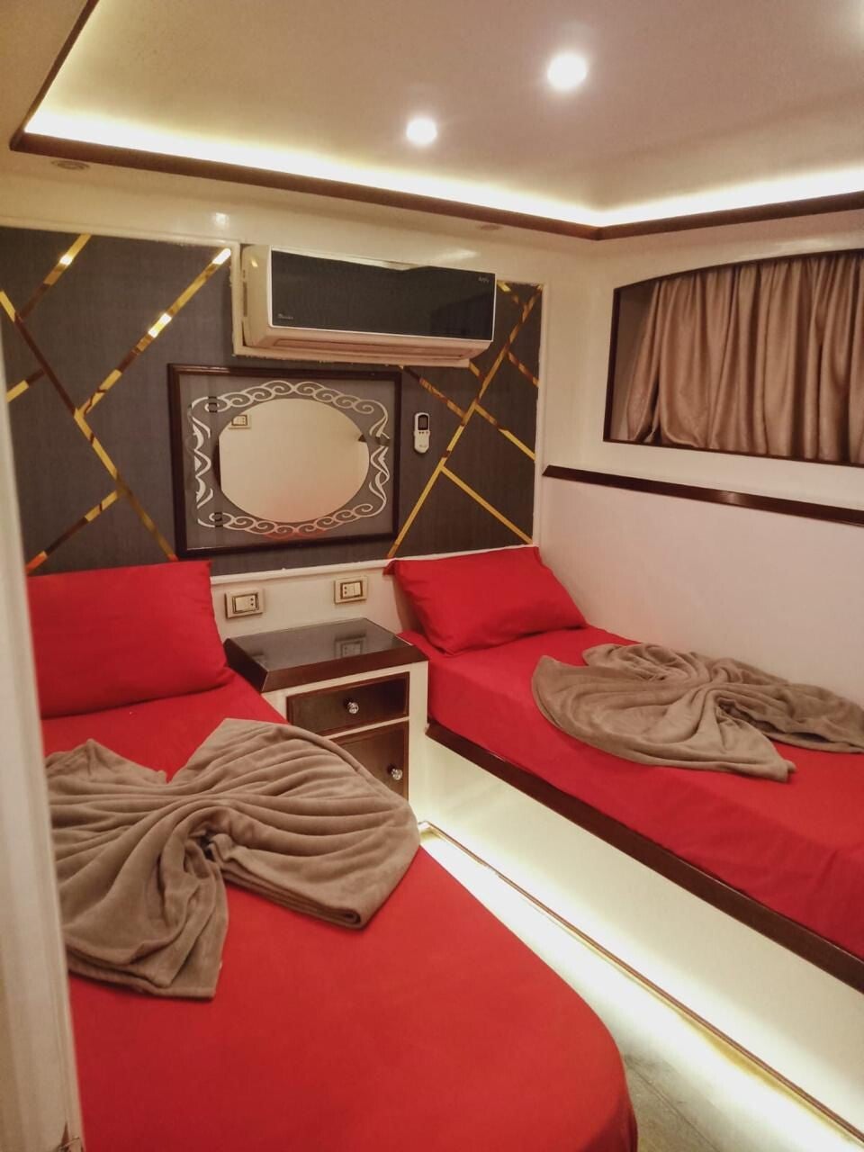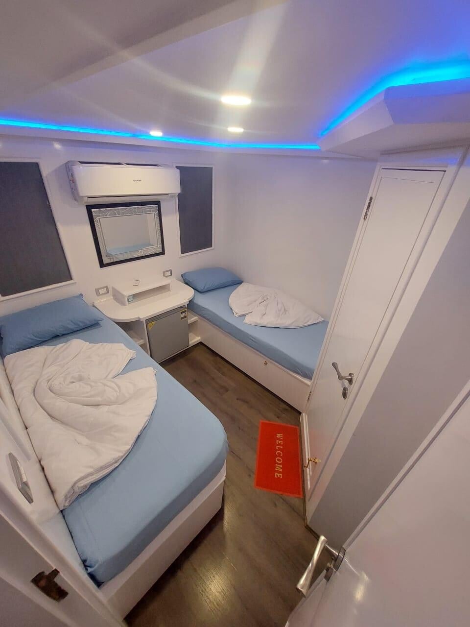 On Saturday, we fly to Egypt and everyone arrives at Marsa Alam airport. Here we are picked up and taken to the harbor. The ride takes about 2.5 hours and we stop along the way so you can use the restroom and grab something to eat/drink. On the boat, you can settle into your cabin with a travel companion. A few private rooms are available for an additional cost. You will have your own single bed and a bathroom with a shower and toilet.
